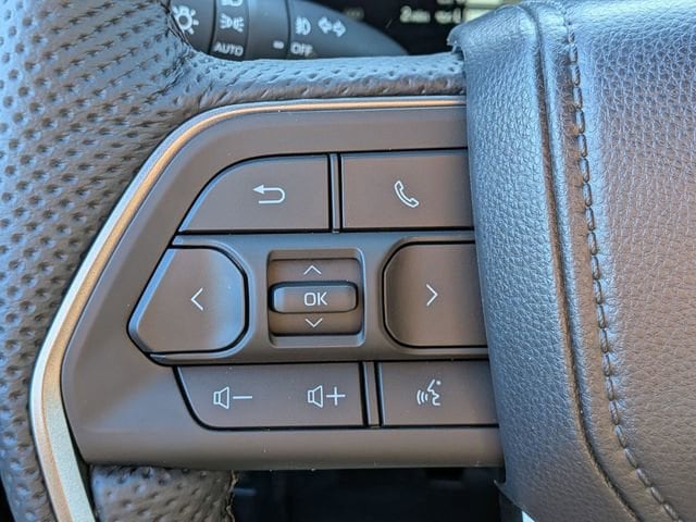 - Leather-wrapped manual tilt/telescopic steering wheel with phone, audio, display/infotainment, and Driver Assist controls